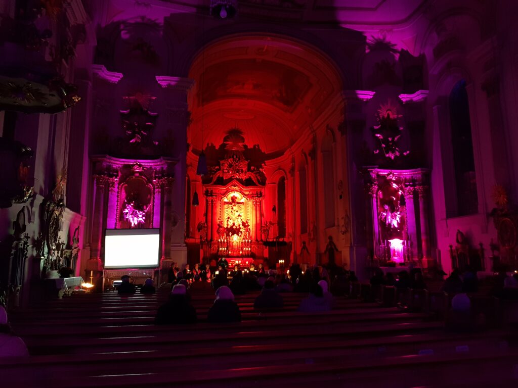 In der Kirche wurde von zwei Musikgruppen einige Stunden gestaltet, damit schafften sie eine wohltuende und angenehme Atmosphäre, auch wurden immer wieder Impuls zwischen Liedern verlesen. Des Weiteren gab es das Angebot vorn am Altar eine Kerze zu entzünden, die Teelichter dazu wurden am Eingang von einem Welcome-Team an die Besuchenden gegeben. Auch konnte man mit verschiedene männliche und weibliche Seelsorgenden das Gespräch suchen.
